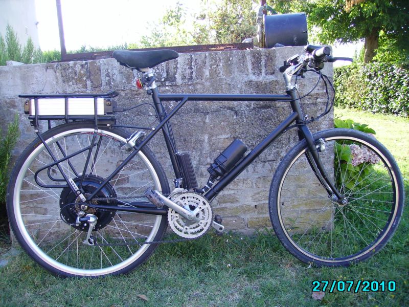 162,52 KB Sono ormai 2 settimane che la stò usando tutti i giorni e devo dire che mi sta dando grandi soddisfazioni. La velocità massima che ho raggiunto in piano e senza pedalare è di 55 kmh, fin troppi direi, una ripresa del motore eccezzionale, non oso pensare all hig torque, come autonomia ancora non sono riuscito a testarla copletamente ma alla media dei 35 kmh ( equivale a dire che in alcuni tratti supero i 40 kmh, ovviamente sempre pedalando )sono arrivato a fare 45 km, a proposito di batteria dopo qualche ricarica la tensione a fine carica ha raggiunto i 58,3V direi non male. Le modifiche che voglio fare sono: 1 raggiare il motore sul cerchio originale da 26 2 sostituire i rapporti originali con un 11-32 3 aggiungere 2 borse laterali (ovviamente nere) in modo da coprire un po il motorone, che adesso è molto evidente e poi credo che serebbero più comode dello zaino attaccato alla schiena. 4 posizionare un interruttore in modo da escludere il gas a pollice, azionare il pas ed il limitatore, ma qui ho bisogno di aiuto da qualche esperto, perche ho già tentato di mettere sotto interruttore il pas interrompendo il filo rosso, ma quando lo aziono la bici va a scatti. Se qualcuno lo ha già fatto e potesse postarmi uno schema gli sarei davvero grato.