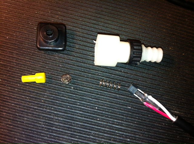 In blu il sensore con le sue saldature (da incollare sul supporto della leva, cioè il corpo pompa, faccia inferiore), in marrone il cavetto, in rosso il magnetino da incollare sulla leva in modo che tirando si affacci al sensore. Ci vorrebbe forse un magnetino un pizzico più grande, perché quello originale deve avvicinarsi molto per azionare il sensore. Quindi ne risulterebbe una installazione un po' delicata.
