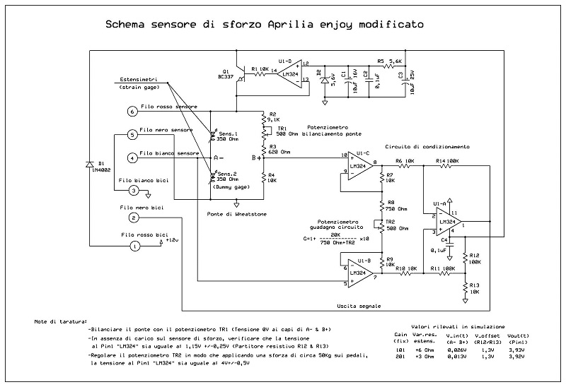 Dal mio punto di vista il circuito elettrico originale è sicuramente funzionante però mi sembra che presenti alcune criticità: Un estensimetro per funzionare correttamente necessita di corrente costante e il fatto di essere alimentato direttamente dal +12V proveniente dalla batteria può renderlo meno preciso. Inoltre non è protetto se la polarità di alimentazione s’inverte. Non avendo estensimetri originali, ho fatto delle simulazioni di comportamento usando un circuito di condizionamento modificato con LM324 ricavandone i dati sotto riportati. In allegato la foto del circuito di test: