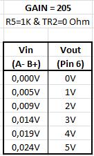 Per completezza aggiungo i risultati ottenuti in simulazione utilizzando il componente INA122. Il test è stato effettuato con il Pin5 collegato direttamente a massa e creando un offset sui piedini di ingresso 1 e 8 tramite il potenziometro TR1. Il guadagno del circuito amplificatore è fisso a 205V/V, cioè ho inserito fra i Pin1 e 8 solo la resistenza da 1K. I valori ottenuti confermano il buon funzionamento del circuito da utilizzare come soluzione alternativa all'originale. L'INA122 è stato comprato in RS "codice" 285-8126.