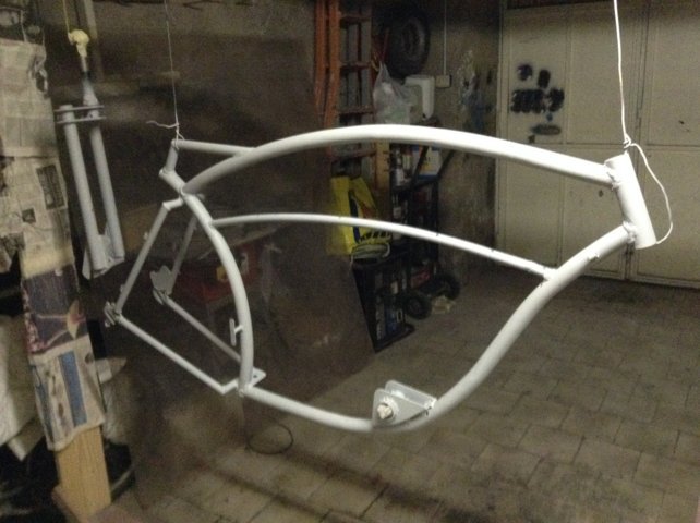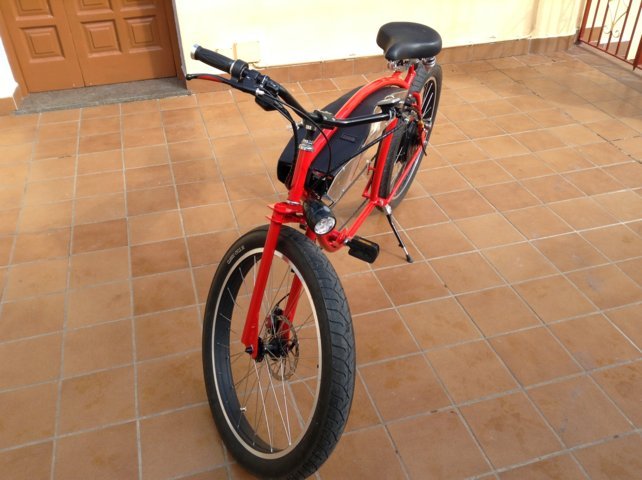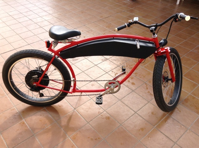 Il telaio è autocostruito con tubi elettrosaldati 33x1.8mm curvati a mano e rulli,peso 3.7KG il forcellone posteriore con tubi 25X2mm la forcella 35x2mm con piastre da 5mm il supporto sella 20x1mm il pacco movimeto centrale con piastra da 3mm box in alluminio per batterie tipo serbatoio benzina con pellicola 3M 3D carbon look. Telaio verniciato e rifinito con fondo antiruggine e vernici acriliche bicomponenti autolucidante rosso fuoco.