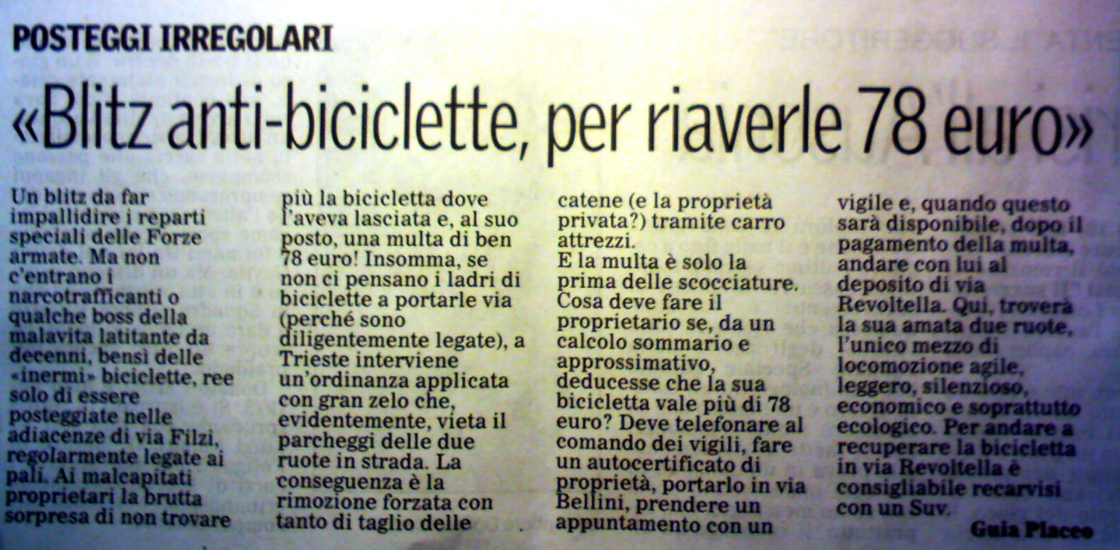 Ma se c'era una bella bici da 2000 euro, un tizio qualunque può andarsela a prendere in comune pagando 70 euro di multa? Operazione completamente illegale, se avevano preso una mia bicicletta anche da 10 euro partiva una denuncia per furto anche perché io non sono garantito che una volta pagata la multa ritorno in possesso della mia bici in quanto non è riconducibile al legittimo proprietario.