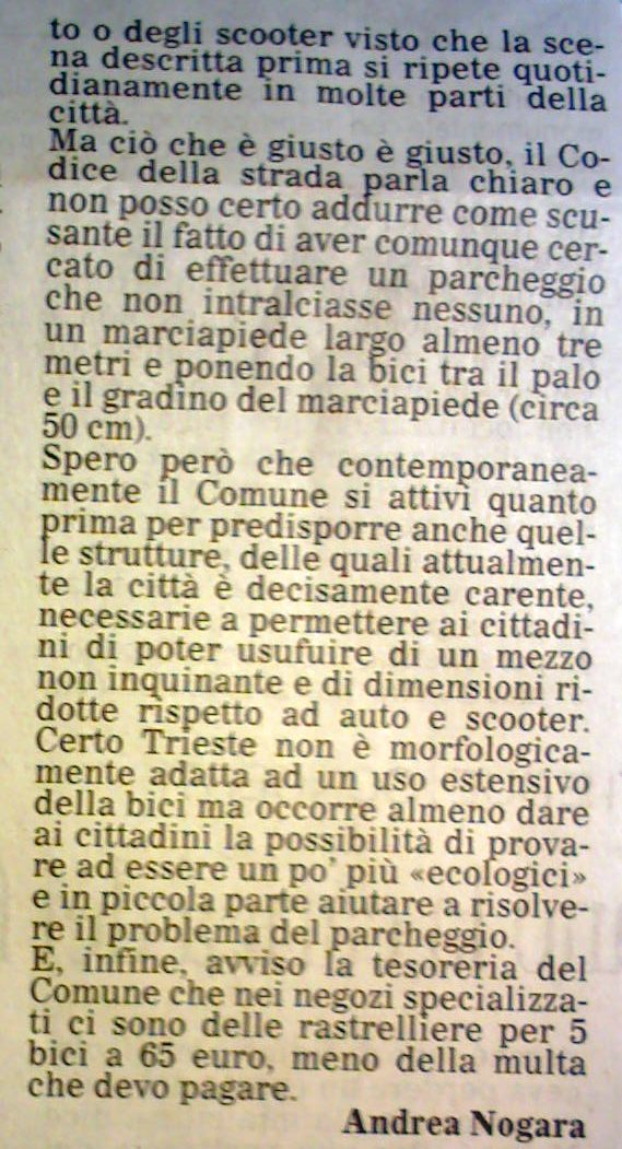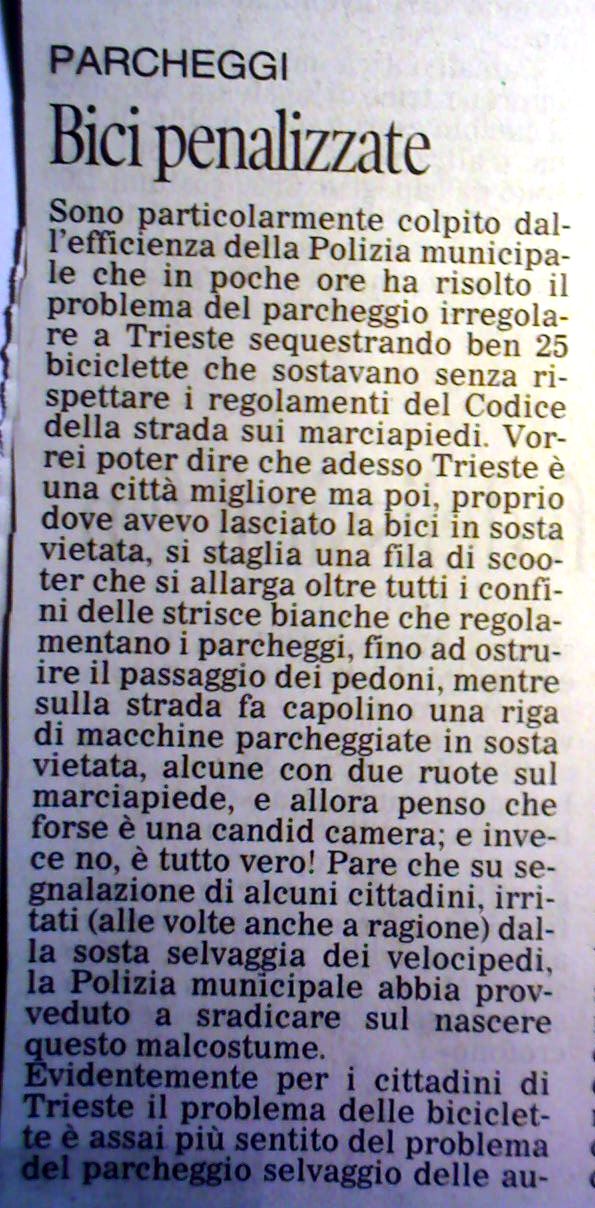 prima di fare le multe (perfettamente legali) gli amministratori o gli addetti al traffico dovrebbero domandarsi dove sono i parcheggi per le bici !!!!!!!!!!!!!!!!!