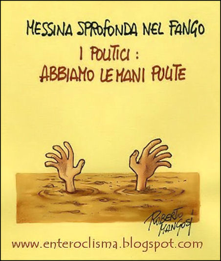 Il testo di una canzone di Modugno recita: Tu ti lamenti, ma che ti lamenti, pigghia lu bastuni e tira fori li denti. Credo non ci sia bisogno di una traduzione... L'invito che ho scelto è emblematico e chiaramente dettato dalla rabbia e dalla sensazione d'impotenza nel pensare che tutto questo era evitabile. Mi rivolgo a tutta la cittadinanza messinese che deve svegliarsi e chiedere civilmente e dignitosamente degli interventi atti a scongiurare il ripetersi di altre disgrazie. |