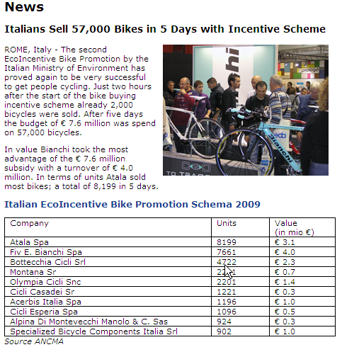 tuttavia non è un fatto singolare che il ministero dell'ambiente dia questi dati per comune e regione e però non quelli per marche, e che questi ultimi non si trovino su siti italiani ma soltanto su siti stranieri? lo stesso dato delle marche fonte ancma citato da jumper, cioè, non si trova sul sito dell'ancma ma solo su bike europe e simili [questo beninteso oggi, 21 ottobre 2009, ore 15:28]...