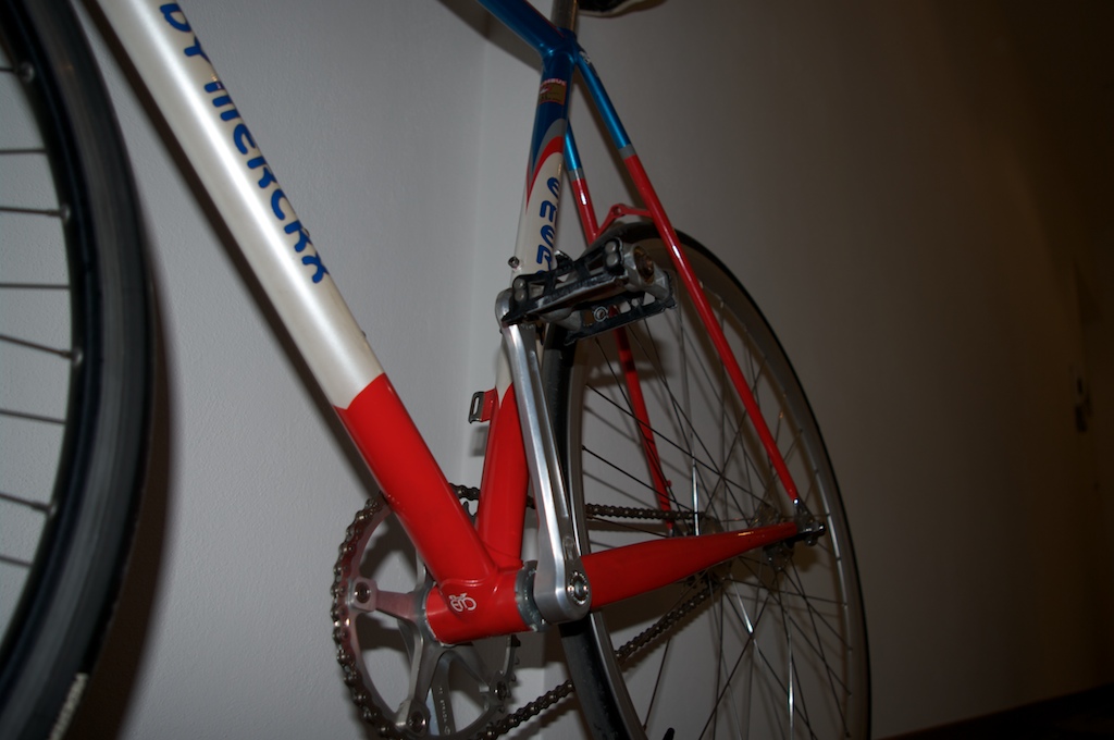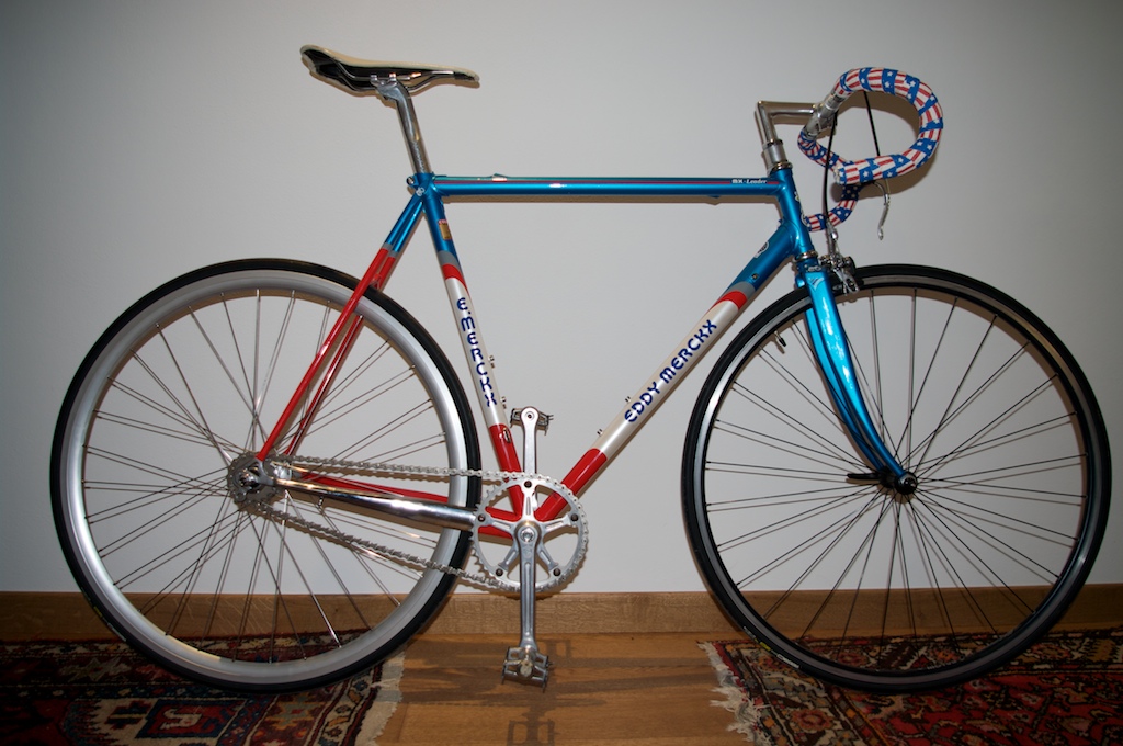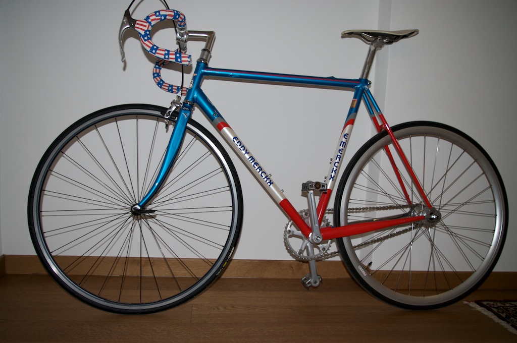 telaio: Eddy Mercks MX Leader primi anni 90; ruota posteriore: mozzo Miche primato pista con cerchio profilo medio (lastazionedellebiciclette); guarnitura: campagnolo vintage modificata con ingranaggio da 42; pignone: Miche da 18; Serie sterzo: no brand; Manubrio e pipa: vintage 3t; ruota nateriore: ambrosio; moviemnto centrale campagnolo veloce; freno anteriore: Miche con leva campagnolo vintage.