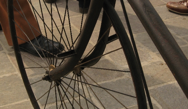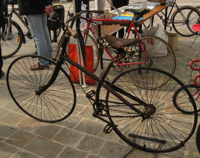 Era una mostra di bici d'epoca organizzata da una associazione chiamata "Pedalalenta" che, come lascia intuire il nome, non ha l'agonismo fra i suoi ideali primari  RIgorosamente solo freni anteriori (ammesso che un coso che preme sulla gomma possa frenare...). Rapportino da trattore mica tanto...dalla foto forse non si capisce ma le ruote sono enormi! C'erano diverse bici di quelle "professionali" da fornaio, barbiere, macellaio, sarto ecc di proprietà di un simpatico tizio di Ravenna del quale non ricordo il nome. Ho fatto diverse foto, magari ci apro una discussione a parte! |