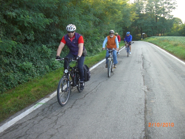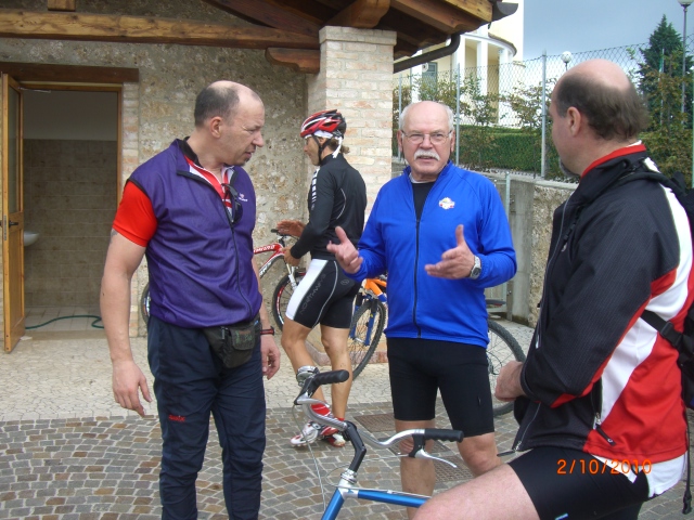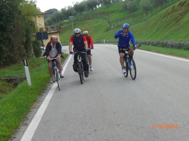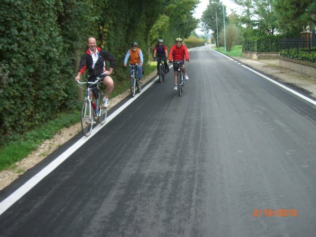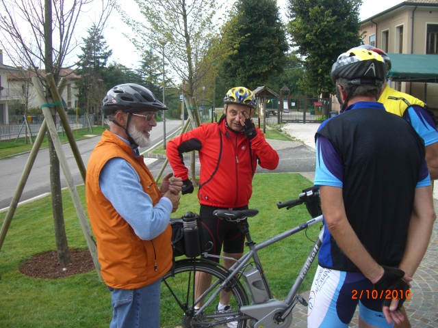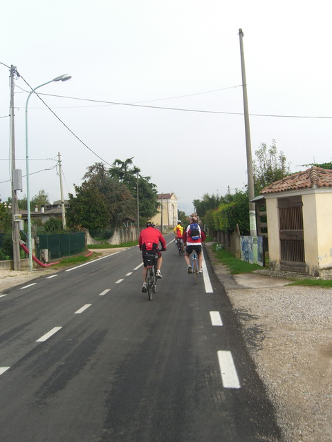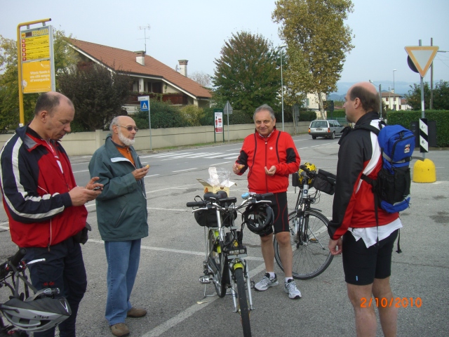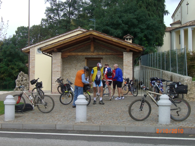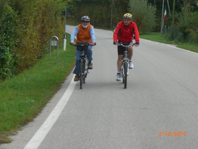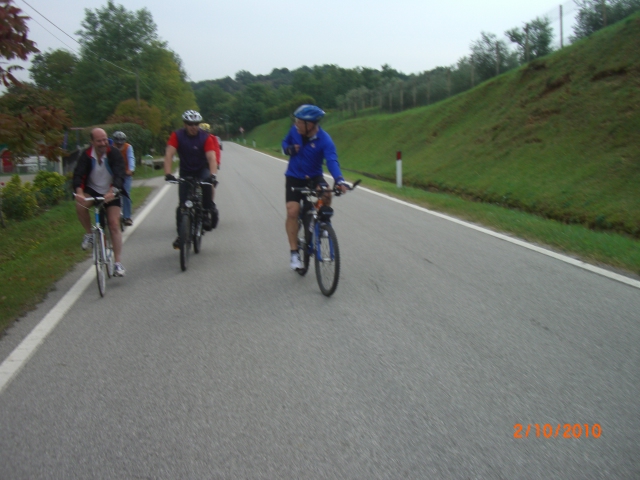 Saluti e strette di mano, scarico della bici e partenza. Sono ormai le 10:30, siamo un po' in ritardo sulla tabella di marcia, ma pedaliamo subito con grande impegno. La parte iniziale sarà un po' difficoltosa perchè richiede l'attraversamento del trafficatissimo centro Di Montebelluna. Comunque con le nostre bipa riusciamo a svincolare abbastanza velocemente e ci portiamo ben presto sull'itinerario programmato: la panoramica, strada a basso traffico veicolare che costeggia a Nord le pendici del Montello