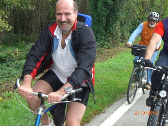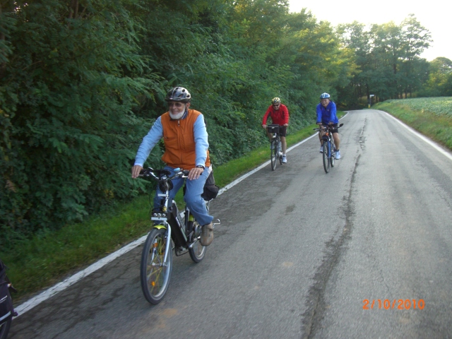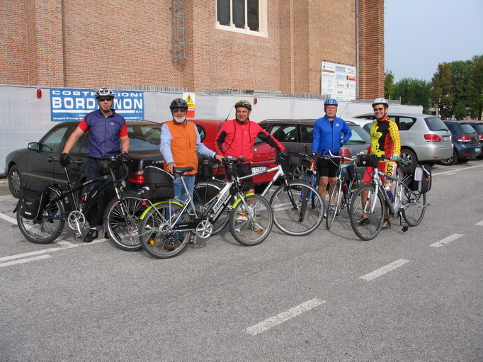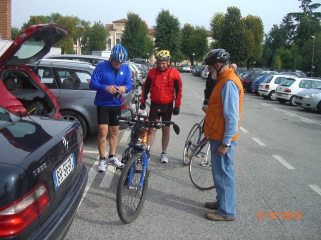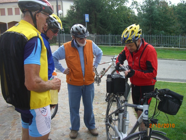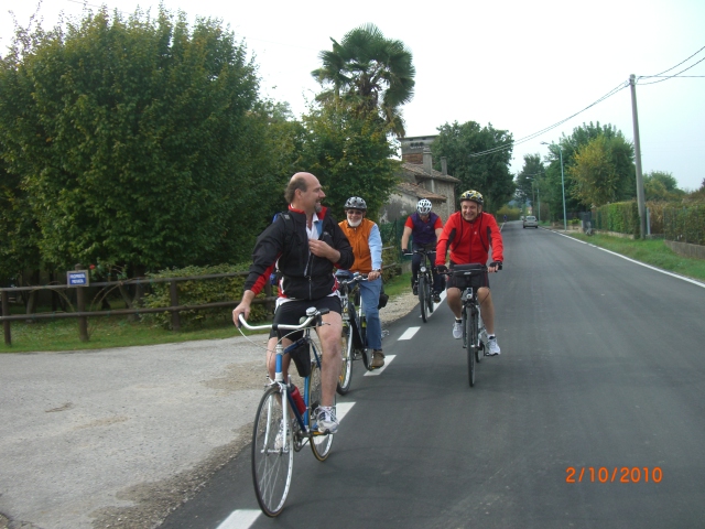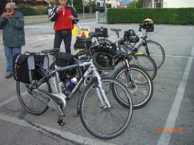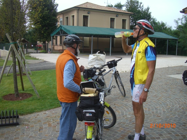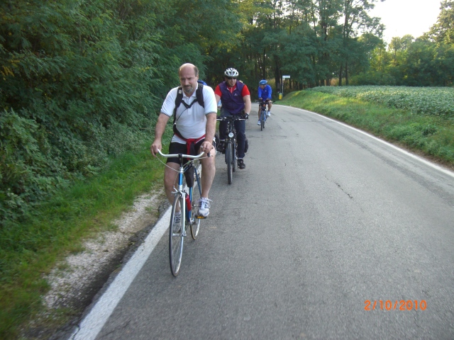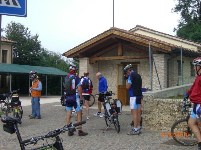 Saluti e strette di mano, scarico della bici e partenza. Sono ormai le 10:30, siamo un po' in ritardo sulla tabella di marcia, ma pedaliamo subito con grande impegno. La parte iniziale sarà un po' difficoltosa perchè richiede l'attraversamento del trafficatissimo centro Di Montebelluna. Comunque con le nostre bipa riusciamo a svincolare abbastanza velocemente e ci portiamo ben presto sull'itinerario programmato: la panoramica, strada a basso traffico veicolare che costeggia a Nord le pendici del Montello