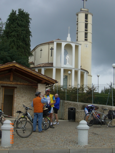 Fra strappi e falsopiani, arriviamo finalmente in cima al Montello: S. Maria della Vittoria, 360m.s.l.m. Sono quasi le 12:30, ma qui una sosta è d'obbligo. Molto comoda la fontanella e i bagni messi a disposizione dalla locale associazione alpini. Infatti qui c'è sempre un via-vai di ciclisti che approfittano dei servizi per un pit stop. Naturalmente le nostre bipa non passano inosservate e attirano subito i vari ciclisti in sosta che chiedono informazioni sui nostri mezzi.