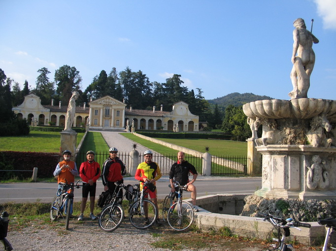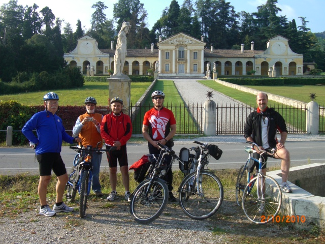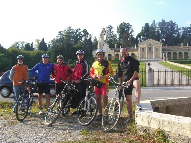 Intanto le varie portate (antipasto, 3 primi e 3 secondi oltre ai contorni suddetti) si susseguono senza soluzione di continuità. Ad un certo punto c'è chi - messo duramente alla prova - inizia a malincuore a "passare". Io invece che sono una buona forchetta, assaggio tutto senza omettere nulla! E per finire: dolcetti tipici della casa con l'iimancabile bottiglia di prosecco fresco, a segiuire caffè, grappa e liquore di mirtillo. Nonostante tutto, alla fine riusciamo ad alzzarci (un po' faticosamente) dal tavolo. Paghiamo il prezzo concordato, ringraziamo e salutiamo. Quando lasciamo il locale sono circa le 15:30!!!!Alla faccia del pit stop! Siamo un po' preoccupati per Monta in bike (che ha la muscolare), ma vediamo già dai primi Km che se la cava benissimo, anche perchè ormai il tracciato è tutto in falsopiano. Torniamo quindi sulla panoramica e dopo aver attraversato i piccoli centri di Ciano, Crocetta e Magaré, giungiamo a Maser, presso la bellissima villa Bararo: un capolavoro del Palladio.