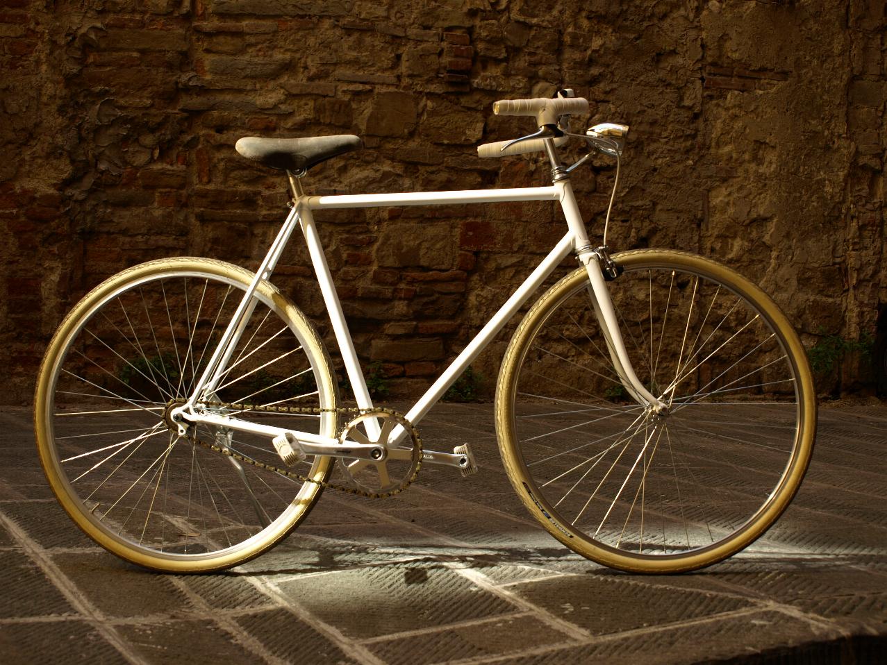 Il colore doveva essere bianco; mi sono orientato su un satinato... Ho riverniciato il telaio e poi mi son divertito a comprare pezzi qua e la nei biciclettai di firenze (ben tre diversi negozi!); la catena l'avevo comprata in Giappone durante il mio ultimo viaggio a gennaio.