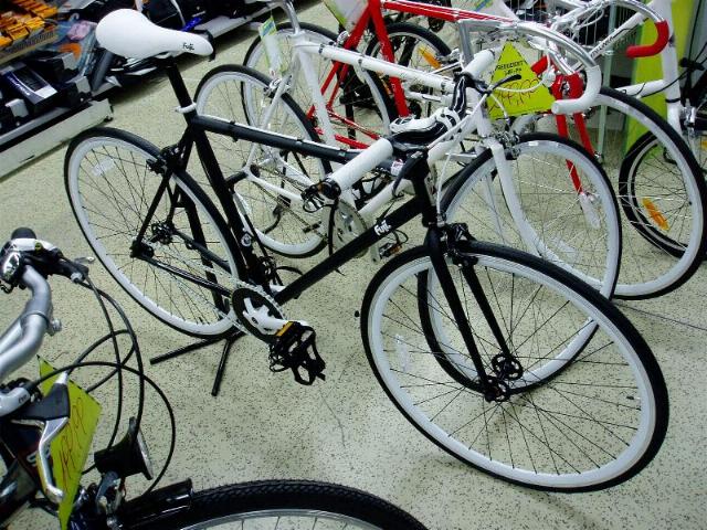 Stavo girovagando annoiato dentro un mega centro commerciale con la consorte imbizzarrita e io coi musi quando vedo una enorme scritta rossa "Hervis": a occhio e croce sono i cugini del decathlon, avevano diverse bipe e alcune chicche tra le quali questa fixed nera opaca c'era pure una minivelo marchiata "scirocco"  |