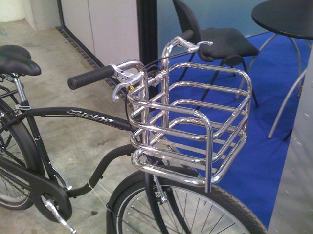 Concludo con la foto di una genialata che ho visto per la prima volta, cioè un manubrio metallico che incorpora un robusto cesto anteriore, tutto cromato.