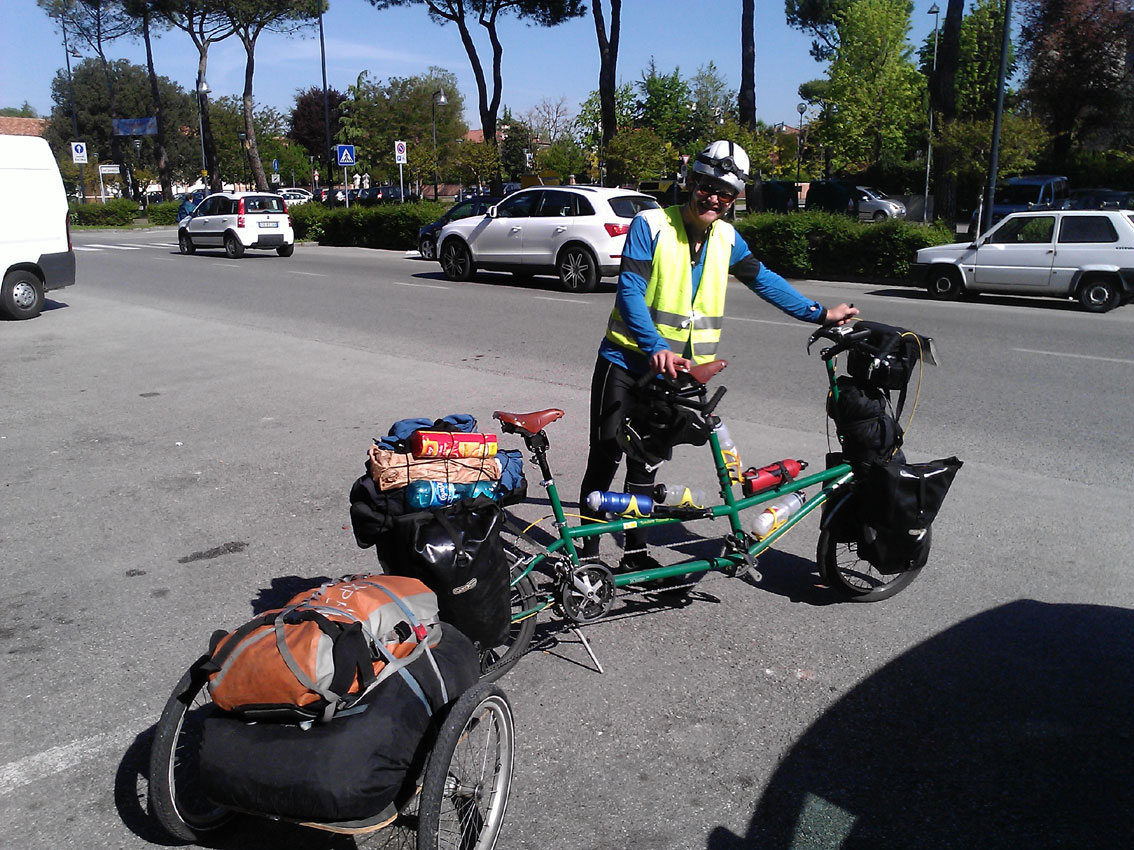 Questa mattina passeggiando per il centro di Martellago (VE), ho incontrato Ashley Weyman-Jones, uno dei due ciclisti volanti, mentre stava aspettando la sua compagna di viaggio, Laura Hegarty, entrata in un negozio del paese.