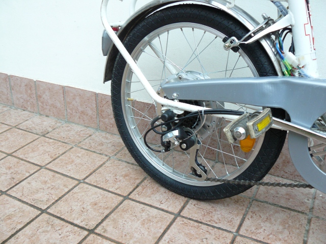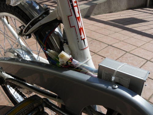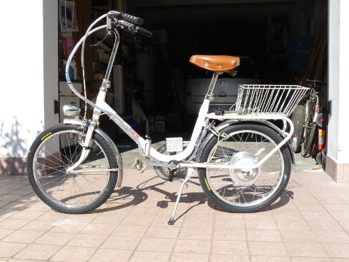Nuntio vobis gaudium magnum, habemus bipam ! (per chi non ha fatto le scuole alte: primo test della mia pieghevole elettrificata). Oggi pomeriggio ho connesso tutti i fili alla centralina, ho attaccato tutti i fili troppo lunghi ed a penzoloni con del nastro carta al telaio, ho preso una batteria da "cinesona", l' ho avvolta in uno straccio, l' ho fissata al portapacchi di traverso collo spago e mi sono lanciato fuori dal garage ... Azionando il selettore a 3 posizioni, si sente una variazione di potenza del motore. Mi sono accorto che la biella del pedale destro tocca sonoramente sul carter della catena, per cui dopo 300 metri sono subito rientrato :-( Adesso mi dedicherò alla messa a punto dei particolari ed a studiare la sistemazione definitiva dei vari componenti (carter per primo). Non mancherò di tenervi aggiornati sugli ulteriori sviluppi. Ciao !