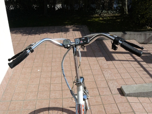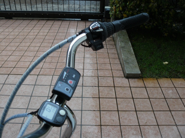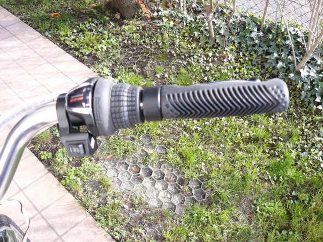 particolare di montaggio del comando cambio (Shimano) sul manubrio. L'ordine di montaggio, dall'esterno, è: manopola normale (fissa), leva freno, comando cambio, selettore potenza motore Immagine: