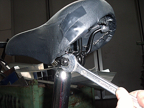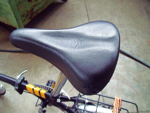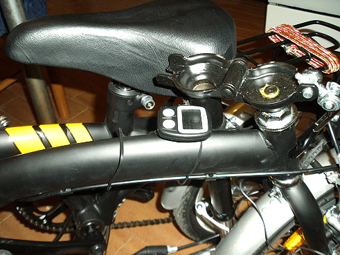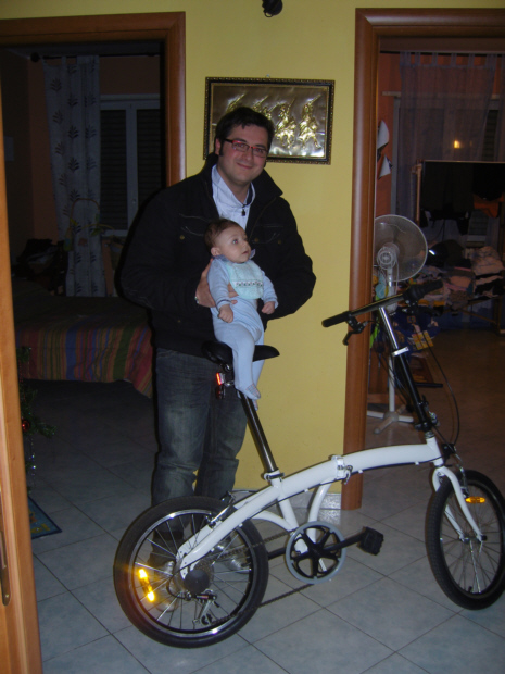 e la mia ricambia i saluti con qualche altra foto ed aggiornamenti tecnici. @filcancal:se gli abbassi la sella il nipotino comincia a girare per casa come faccio io intorno al tavolo della sala oggi ho regolato la sella,usando una chiave di 14 si possono allentare i due dadi (quello che si vede in foto ed il corrispettivo dall'altro lato) per far scorrere per qualche centimetro la sella in avanti e indietro e a scatti si puo' inclinare la sella verso l'alto o il basso,la mia era tutta avanti e l'ho messa tutta indietro e poi scivolavo un po' in avanti allora l'ho inclinata un po' su ed adesso mi sento stabile,lo scotch che si vede sul fianco della sella e' perche' e' venuta a contatto con lo snodo del manubrio durante una piegatura e si e' bucata,ne ho altre o magari ci mettero' un coprisella;la leva che si usa per piegarla in due sporgeva un po' ed allora ho deciso di prendere una pinza e provare a piegarla,e' andata bene se era di ghisa poteva rompersi;ho fatto altre cose ma le posto domani.