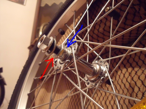 per la scorrevolezza ho provato a smontare la ruota per vedere se dentro c'era il grasso,e' tutto a posto,i dadi segnati nella foto sono stretti e la ruota facendola girare a mano si ferma presto,basta allentarli di 1 millimetro e tenendola in mano e dandogli un leggero colpetto gira che non finisce piu' di girare,non ho fatto il video solo perche' ho perso la concentrazione che mi e' caduta una sfera mentre guardavo come era fatto dentro il mozzo della ruota;ho fatto un giretto in una strada in mezzo ad un bosco,in salita la bici va bene e pure in discesa,i freni sono potenti,fischiano un po' pero' sono ancora da rodare,in discesa pedalando ho toccato i 40,4km/H sono rimasto stupito dal senso di sicurezza,a guardare la bici sembra un trabicolo per il tubo sella e il manubrio molto lunghi pero' la bici se gli snodi sono stretti bene e' stabile,cosi' nella discesa successiva meno ripida ho fatto il video e guidando con una mano sola ho toccato i 31km/h.