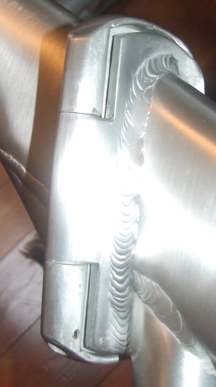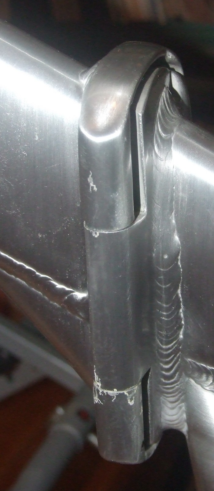 ecco le foto della cerniera della bici: da un lato verso il basso si vede una vite che tiene il cardine all'interno, e sotto si puo vedere il foro da dove il cardine potrebbe uscire; il lavoro potrebbe consistere nell'estrarre il cardine, allargare il foro delle tre cerniere e rinserire il perno: più facile a dirsi che a farsi.(Quei segni che si vedono sulla cerniera della prima foto credo che si tratti di residui di colla di una etichetta)