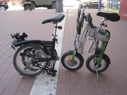 Ciao a tutti in questo week end sono stato a roma e oltre a partecipare alla cm, ho avuto modo di testare la mobiky che ragno gentilmente mi ha fatto provare. Voglio condividere alcune impressioni. Appena salito sulla bici, dopo aver regalato al massimo in altezza il tubo sella, ho una sensazione strana di guida un pò indietro rispetto alla posizione avanzata di sella. Dopo un po’ passa. ..In ogni caso non sto a mio agio perchè avrei bisogno di un tubo sella telescopico..credo la massima altezza per la mobiky sia per persone di 183 cm..io faticavo un po’. Le ruote sono piccole però molto scorrevoli e la bici va, anche se non con la stessa scorrevolezza della brompton. In cerca con ragno di qualche strada un pò sconnessa dove testarla, abbiamo fatto qualche leggera salita e le marce cambiano abbastanza bene, anche se in salita il primo rapporto è molto duro e si fa fatica anche per chi è allenato secondo me. Il manubrio e il controllo della bici non mi sono sembrati eccezionali..la bici tende a mio avviso a essere difficilmente gestibile, o forse sono abituato al controllo perfetto di guida della brompton. Ragno mi fa vedere come si apre e chiude la bici e effettivamente lo spazio di ingombro è minimo e la velocità di chiusura soprende..molto positiva la possibilità del trascinamento come trolley sulle ruote della bici. Il peso..onestamente pensavo peggio, o meglio mi ricordavo peggio avendola sollevata diverso tempo fa..forse è un kg un un kg e mezzo in + della brompton Ricapitolando 1)aspetti positivi: chiusura e apertura molto veloce, poco ingombro, ruote piccole scorrevoli,ottima la possbilità di trascinamento come trolley,buona fattura della bici nonostante sia alluminio, ruote assorbono bene le asperità 2)aspetti negativi: poco controllo del manubrio bici, strano assetto di guida un pò indietro e un pò avanti..non so spiegare, un pò troppa roba di plastica(cavalletto non mi convince), freni poco presenti. poca adatta a salite si fa fatica, cambio discreto ma duro nella prima marcia.