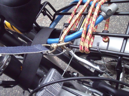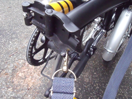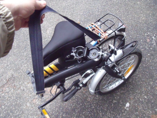 da qualche parte avevamo postato una soluzione simile realizzata da un coreano credo, con una dahon... io con la brompton ci ho provato ma la trovo troppo scomoda -- dipende probabilmente anche dall'uso... di buono c'è che portarsi una cintura dietro non pesa nulla e all'occorrenza può servire anche per altre cose