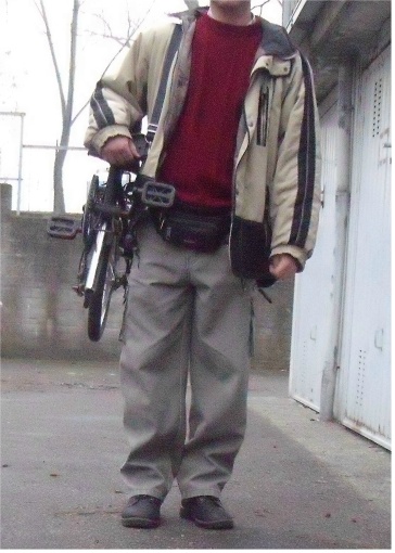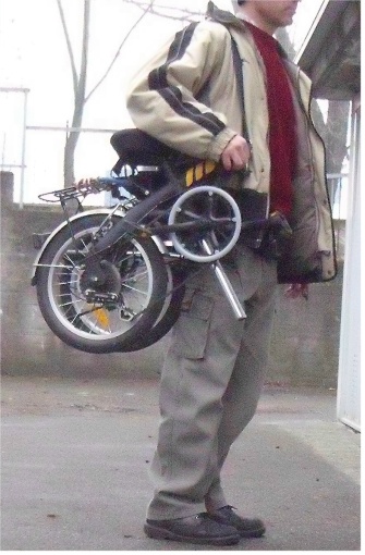 usando la pieghevole si ha una visione migliore delle problematiche che si possono presentare e prendendo anche spunto da delle cose che esistono di gia' a volte si possono trovare delle soluzioni molto semplici,da una borsa che mi aveva dato in omaggio la banca molti anni fa ho preso la cintura per portarla sulla spalla,ho agganciato i moschettoni alla bici ed adesso posso portare la bici in spalla se uno vuole migliorare il confort ci puo' aggiungere un imbottitura di quelle apposite per cinture.