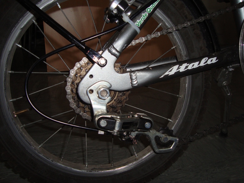 Per il cambio ho saccheggiato uno shimano sis 5 marce, con cerchio e comando gripshift alla MTB da 16 della mia bimba (tanto cosa se ne fa del cambio che va ancora con le rotelle ) e l'ho montato sulla mia pighevole. Il montaggio è possibile anche se il forcellino non è predisposto perché è un cambio che si monta direttamente nell'occhiello dove va l'asse della ruota: