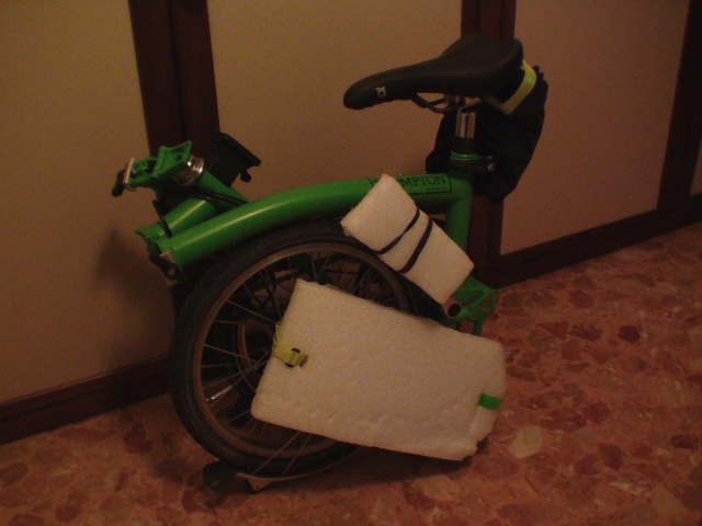 Ciao a tutti Problema : come trasportare la Brompton sui portapacchi dei treni senza danneggiare il pedale sinistro ed il telaio quando non è presente lo spazio tra gli schienali come sui treni a due piani ? Io non ho trovato nulla di meglio che la soluzione seguente. Assomigliano a due pezzi di polistirolo, ma non lo sono(forse è depron). Sono fissati con due cinturini in velcro più un'elastico, il tutto ricoperto con il telo nero della brompton. I due pezzi simili a polistirolo stanno all'interno della C bag. Qualcuno ha un'idea migliore ? Con l'occasione anche a voi il contachilometri senza fili non funziona perchè la distanza manubrio\ruota è superiore a 60cm. Grazie Giuliano