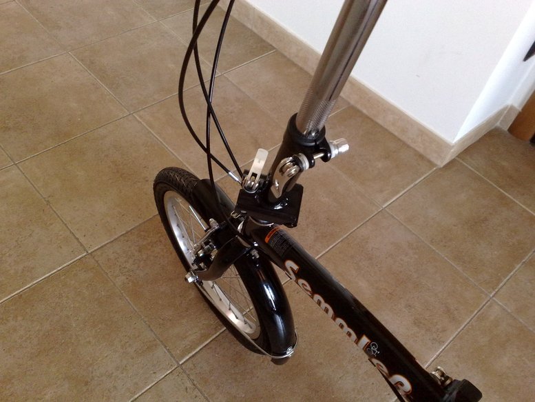 ok risolto! allora: il problema era la posizione in cui era stato assemblato il blocchetto con la cerniera del manubrio. ho allentato la brugola (normalissima filettatura, solo un po duretta) e l'ho girato appena appena in senso orario. poi come ciliegina ho invertito la leva per stringere il manubrio, perche' una volta piegato il manubrio toccava sulla forcella.