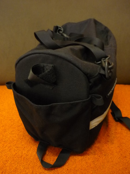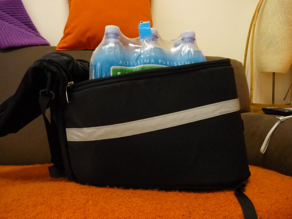 Dopo un pò non ci facevo più caso, si vede che accomodando un pò i piedi è andata meglio. Comunque non è stato piacevolissimo, all'inizio della pedalata, notare che i piedi toccavano. Non voglio fare il lamentoso, però caz... Occhio, in quel caso i piedi "accarezzano" la borsa strusciandola solo di lato, non si tratta di urti di chissà che rilievo. La prossima volta cercherò di caricarla più in altezza che di lato. Mi spiace non aver fatto una foto prima di chiuderla, posso dirvi che sono riuscito a metterci qualcosa come due paia di jeans, 4-5 magliette, un pacchetto regalo, mutande, calzini, un pacchetto regalo, un depilatore e delle creme (robe della mia ragazza), il mio netbook con la sua custodia, un paio di libri non troppo spessi... Insomma, 16 litri non sono proprio pochissimi e giocandoci bene ci si mette abbastanza roba. Ma probabilmente se non si esagera i piedi non toccano ai lati... Nella parte alta della borsa c'è una maniglia e mi è tornata comoda per farci passare un giacchino leggero che non indossavo durante la pedalata. Forse mi sfugge qualcosa ma purtroppo ora devo proprio scappare, ci rivediamo qui! ciaooo damiano