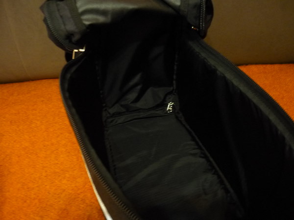 La borsa arriva schiacciata per contenere le dimensioni dello scatolo. E anche rovesciata come un calzino. Per permettere questo schiacciamento c'è un "linguone" di spugna da inserire in un apposito taschino soltanto dopo l'apertura dello scatolo. Dopo aver inserito il linguone si dovrà rigirare la borsa per farla tornare a posto. Mentre cercavo di capirci qualcosa l'ho rigirata 700 volte, avevo anche paura di strappare qualcosa perchè si ha l'impressione di tendere al limite i tessuti. Non pretendevo un manuale di istruzioni ma purtroppo nel mio pacco non c'era nemmeno un disegnino e per poco non buttavo via quel linguone credendo che facesse parte dell'imballo... Foto del taschino per il linguone: