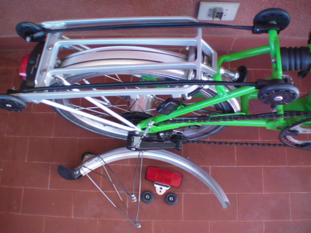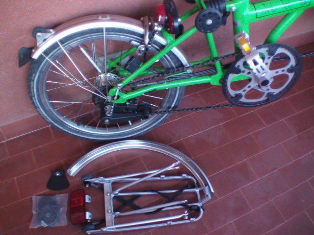 Ciao. Ogni tanto considero l'operazione inversa, cioè lo smontaggio del portapacchi su una M6R. Dopo aver montato una sella Allay e un Marathon al posteriore, il peso è diventato considerevole e in effetti il portapacchi lo uso raramente, cioè quasi solo quando monto la borsa di dietro. La mia brompton ha bisogno di una dieta, vorrei allegerirla un pò. Quindi verrei alle domande: 1)E' possibile comprare il solo parafango posteriore della versione L? 2)Si vende singolarmente anche quello della versione superleggera? Differenza di prezzo e di peso con quello normale? 3)E' ancora disponibile un canotto sella più leggero? Quanto peso si guadagnerebbe? Grazie mille,ciao. Damiano |