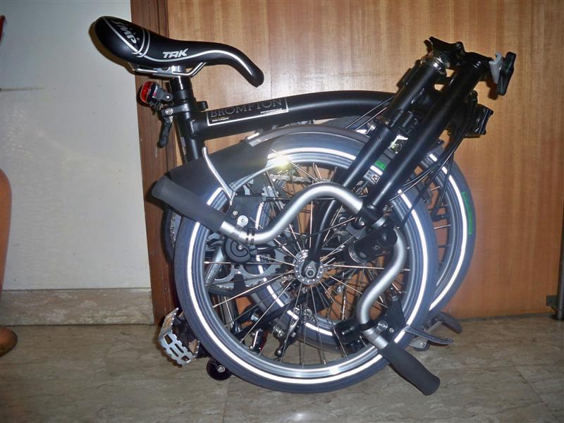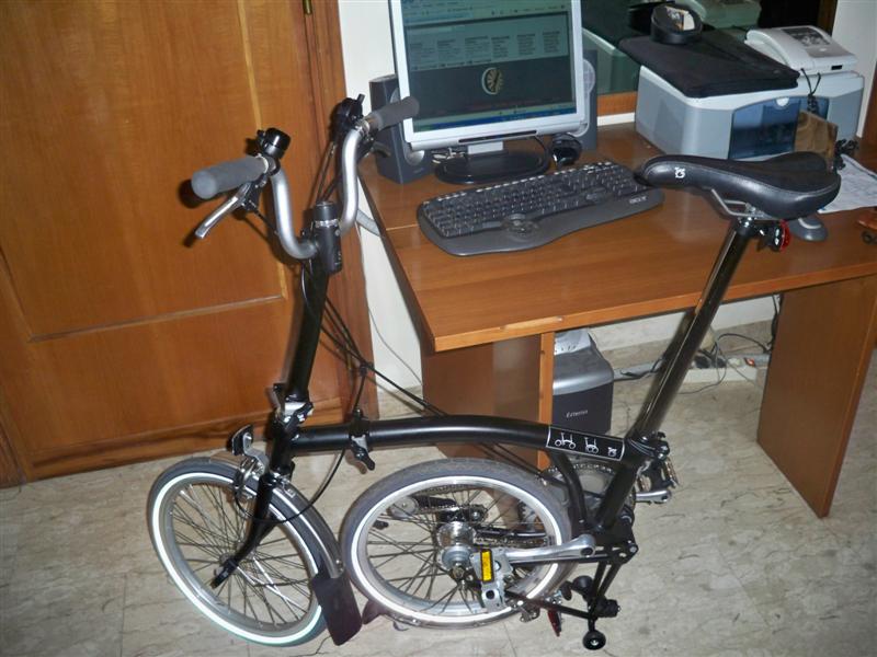 alla fine è successo! sono anch'io un bromptoniano! presa oggi e provata, affiancherà la mia Pashley Sovereign! (bella accoppiata inglese, non trovate?) avevo bisogno di una bicina un po' più bicina della Dahon Vitesse D7, che ho messo in vendita qui, nella sezione mercatino. La Pashley per calme passeggiate comode e rilassate, la Brompton per "incursioni" o per andare al lavoro passando per alcuni tratti sui marciapiedi senza suscitare le ire dei pedoni, almeno spero! da domani si prova! Ancora a Firenze ce ne sono pochine di Brompton, qualche Dahon invece si comincia a vedere. Prime impressioni: il cambio mi sembra più che sufficiente in città, la bici è scorrevole, sorprendentemente scorrevole per un neofita! E adesso, lo so, comprerò qualche accessorio, la Brompton dovrà macinare chilometri! Eccola che consulta Jobike!