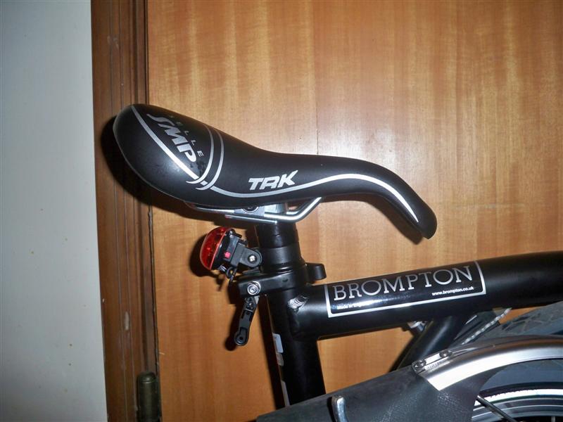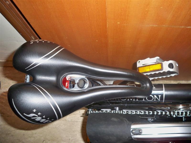 è già tempo di cambiamenti: la sella originale, benché migliore del pezzo di plastica che vedo nelle foto delle b. precedenti, mi ha dato un senso di compressione immediato, ovviamente in zona prostata , l'ho fatta sostituire con una smp montata un po' inclinata (forse troppo?), cmq non sta male sulla b., esteticamente parlando. E' un po' inclinata perché abbiamo fatto delle prove con i titolari del negozio e mi sembrava che se montata dritta, non mi desse particolari vantaggi. Avevo pensato anche ad una Brooks, ma non l'avrei pagata certo €35 e cmq non c'era un modello adatto (c'erano solo con i molloni)altrimenti l'avrei provata, per fare una comparazione con la Brooks che ho sulla Pashley, comodissima.
