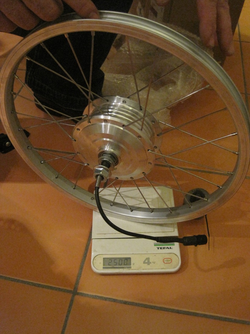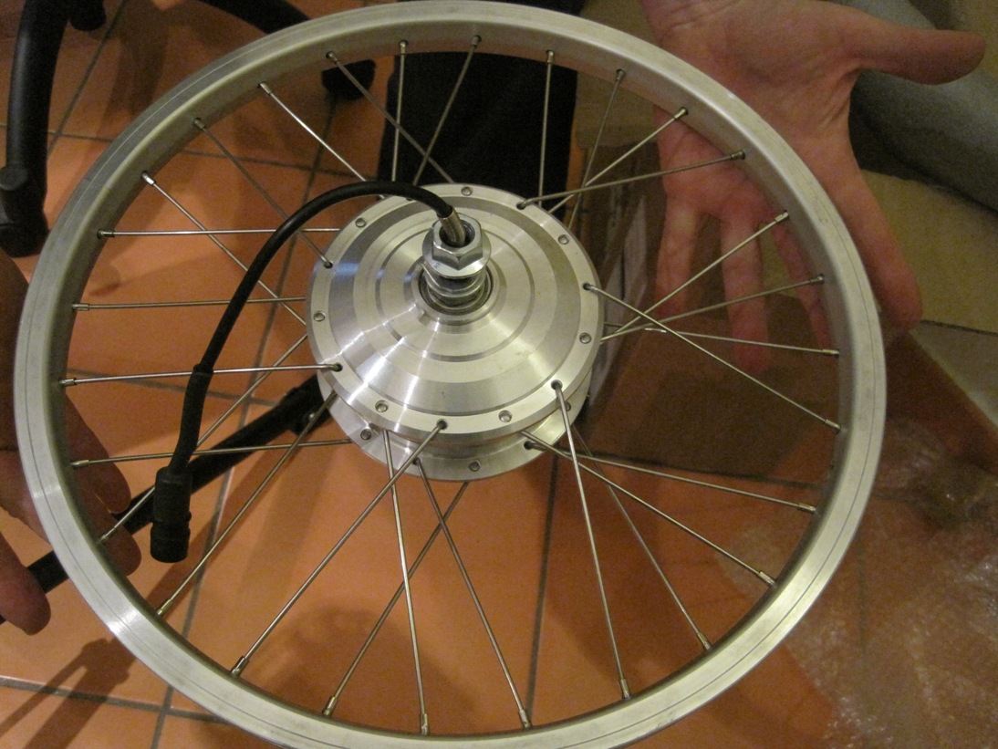 Nella scatola: 1) motore brushless da 250 kw con cerchio 2) batteria Life Po 4 Ah 3) forcella premodificata 4) caricatore batteria 5) centralina, pas e cavi 6) Fili per collegare la batteria 7) libretto di istruzioni Immagine: