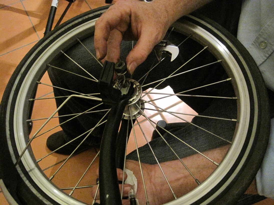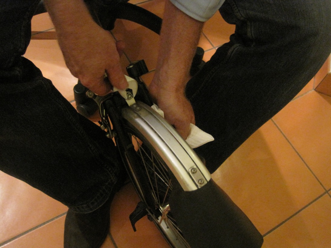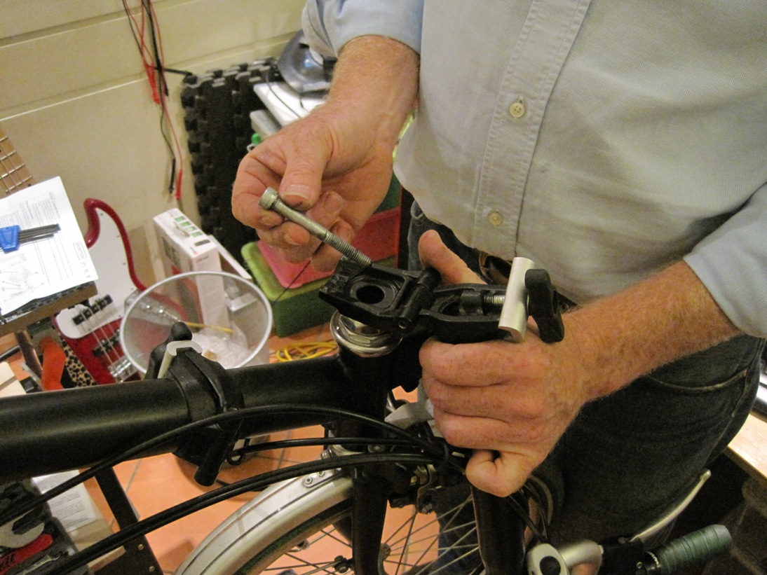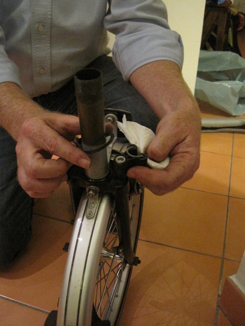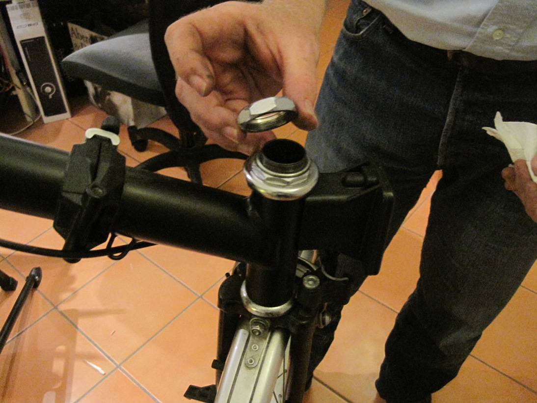 Il primo intervento da effettuare è l'estrapolazione del cannotto che serve per togliere la forcella dalla bici. L'operazione presenta subito delle difficoltà. Riusciamo a capire dal libretto che è necessario svitare di poco (tre o 4 giri al massimo e non toglierla completamente) la rondella all'interno del canotto, al fine di rendere più agevole l'estrazione del cannotto. Immagine: