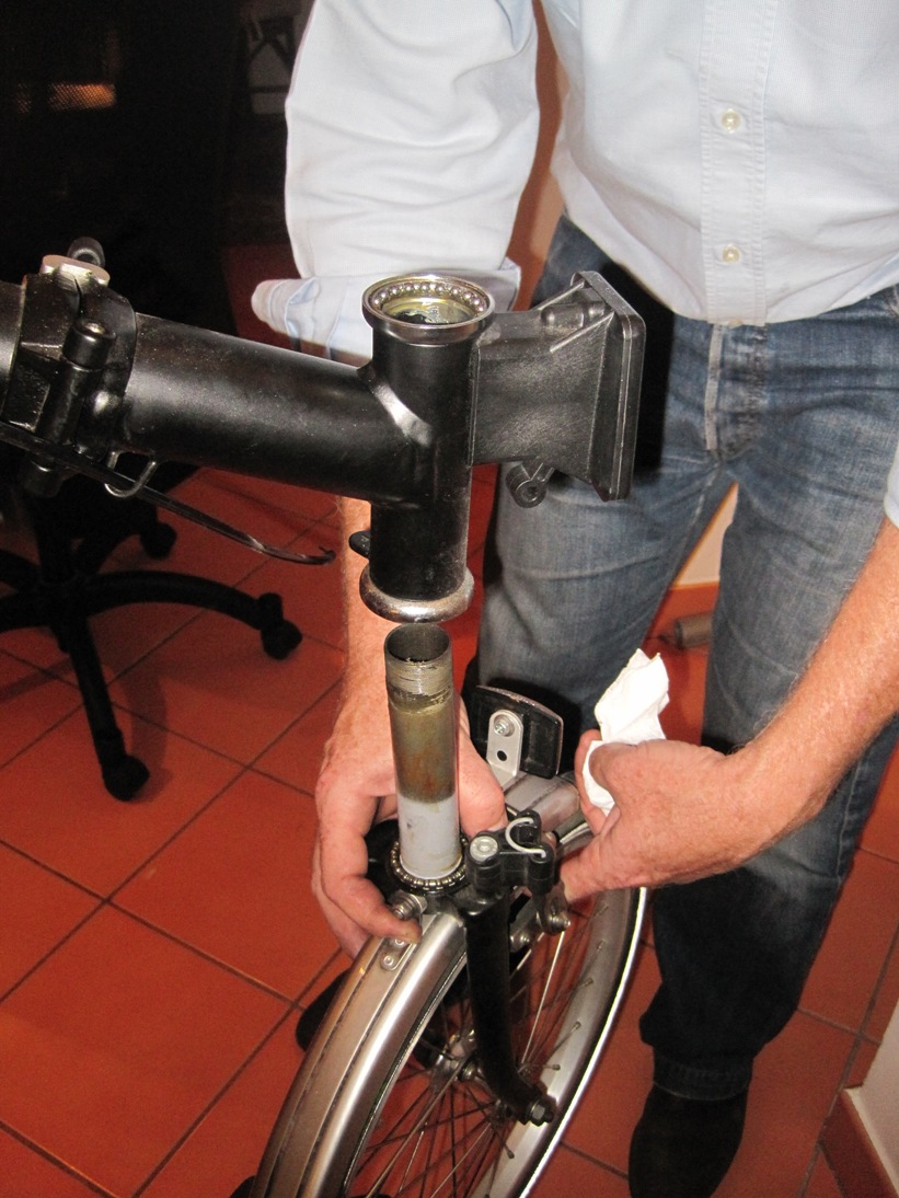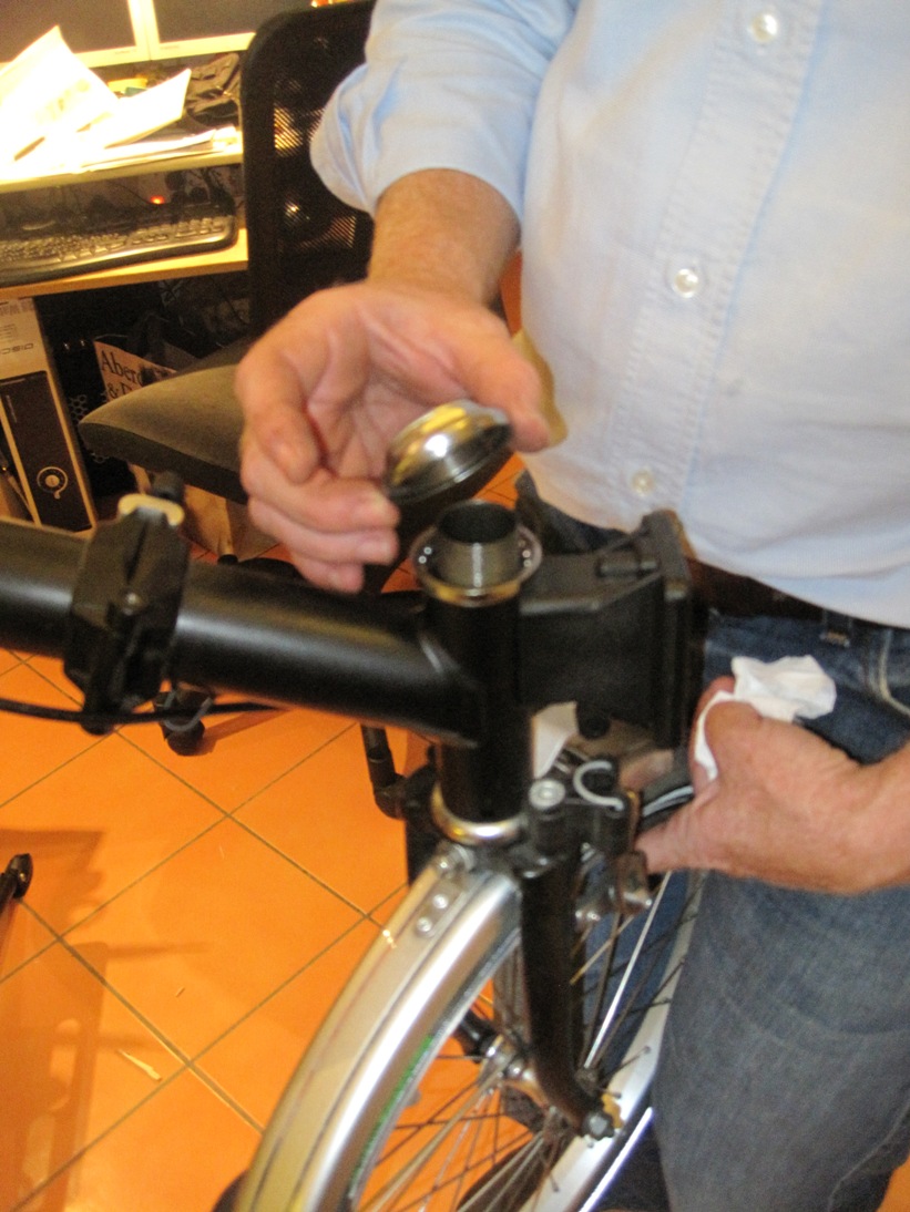 | Forcella Anello di plastica (faccia stondata in basso, faccia piatta in alto) Cuscinetti (con il lato delle sfere libere in su) Telaio Cuscinetti (con il lato delle sfere libere in giù) Dado pressa-cuscinetti Rondella con dentino Controdado Manubrio (completo di cuneo e bullone). |