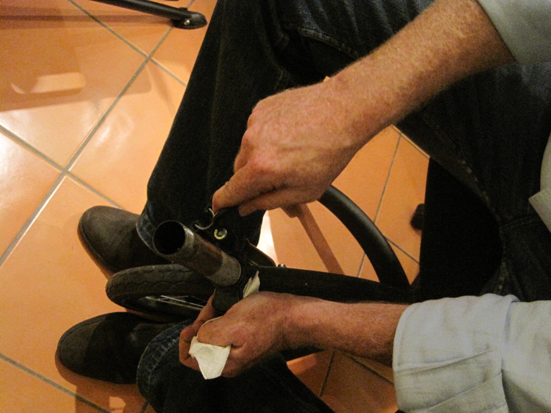 Ma il tutto risulta essere abbastanza difficile in quanto nonostante vari tentativi svitadno e riavvitando varie volte il cannotto non esce. Il dottor necks consulta alcuni siti inglesi e riportando un pò quello anche scritto sul manaule in dotazione risce a capire che è necessario sempre svitare un poco la rondella e che bisogna dare una cacchiarola di martellata (l'espressione inglese non la ricordo ma si può tradurre solo in napoletano ) su tale rondella per far si che all'intenro del cannotto le parti combacianti si dividano e che il cannotto venga fuori. Sulla spiegazione specifica tecnica meglio sentire il dottr necks. Il dottore dopo diversi tentativi effettuati, esegue parecchie martellate pesantissime sulla rondella e ovviamente io spero che non tocchino la bici ...e tanto furono le mie preghiere che infatti le martellate purtroppo colpiscono il dito del dottore che inizia a sanguinare ma lui però non si arrende e con una amrtellata ancora più forte riesce a estrapolare finalment eil cannotto, con grande esaltazione generale.