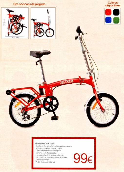 L'immagine è tratta da un forum spagnolo e si riferisce all'offerta di un solo giorno. Ne ho trovata una usata in un inserzione a 130, a tre velocità con cambio esterno. Sembra una delle tante simil Brompton in salsa asiatica con delle pretese di monoammortizzatore (di cui immaginando la qualità farei a meno) telaio in alluminio e con freno post. a tamburo ("freno trasero de tambor" dicono gli iberici).