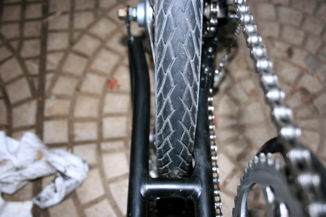 Ho notato che la ruota non è centrata. Dal lato catena solo pochi millimetri separano la ruota dal carro posteriore. Dal lato opposto i millimetri sono mooolti di più.