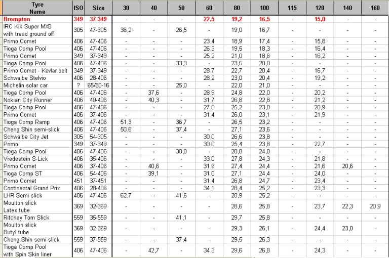 Sul fatto che con le gialle tu non abbia mai forato e non scivoli mi sorprende veramente, invece sulla scorrevolezza puoi togliere il "mi sembra" , vedere questa tabella di un test con vari pneumatici, le brompton gialle sbaragliarono tutte le rivali: