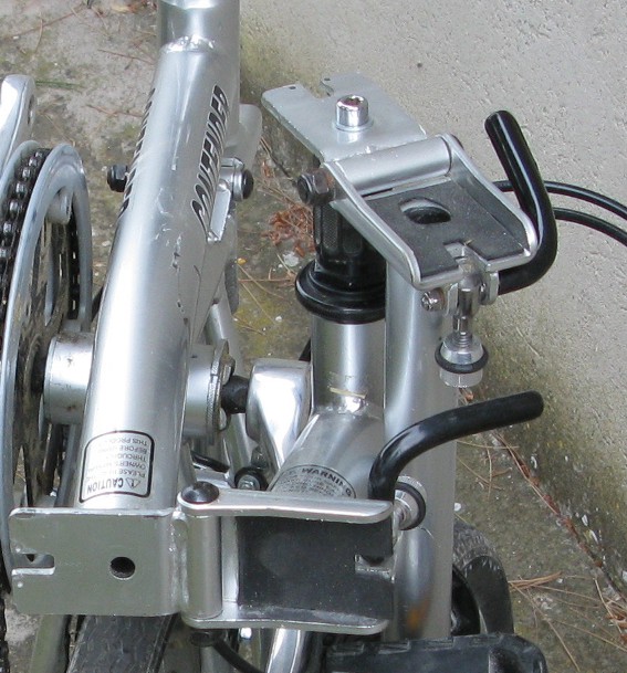 Avendo dei componenti in casa ho provveduto a fare le prime modifiche: tagliato il tubo del manubrio e vi ho inserito un piantone (spada) e montato un attacco regolabile per alzarlo e allungarlo un pò , cambiata la sella, messe delle "guarnizioni" in gomma tra le piastre di chiusura per avere un serraggio migliore, prima sembrava che si potesse aprire da un momento all'altro. Ecco il particolare: